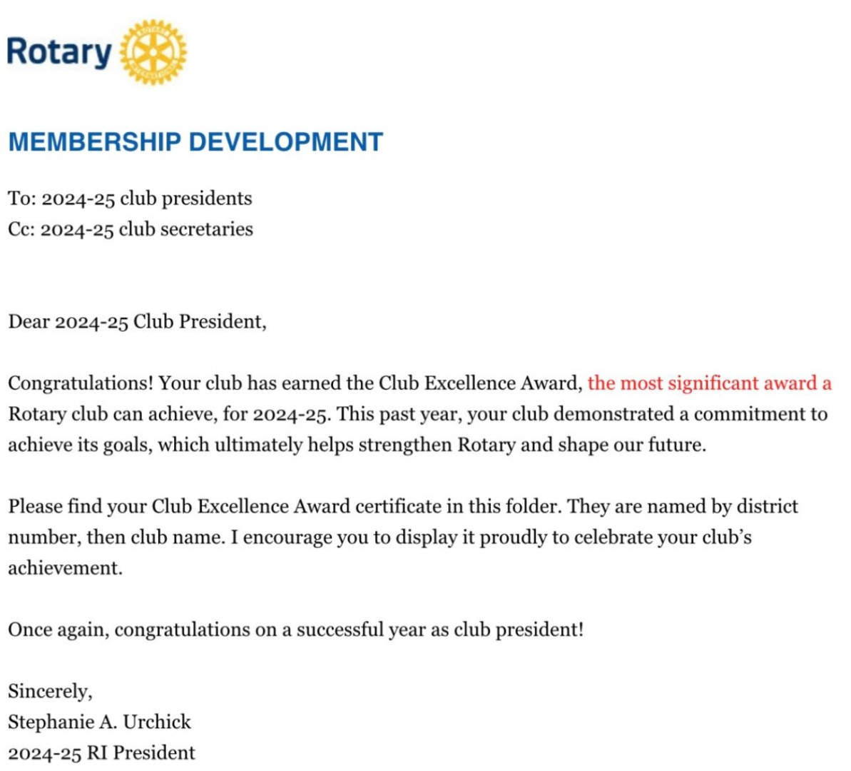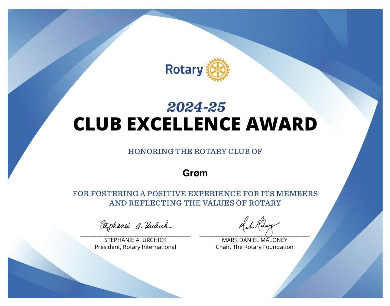 Den gledelige beskjeden om at Grøm Rotaryklubb har fått tildelt Rotary Club Excellence Award er sendt oss av Rotary International President Stephanie A. Urchick!