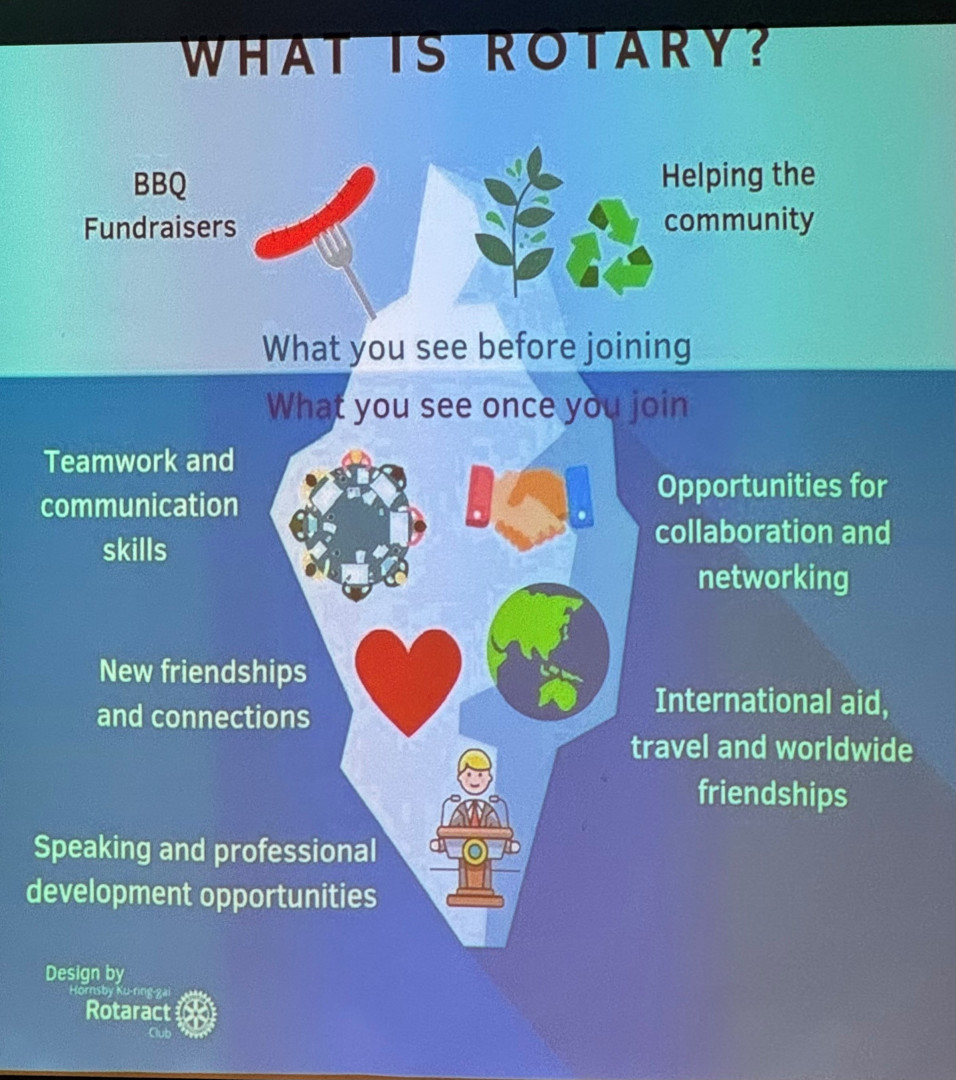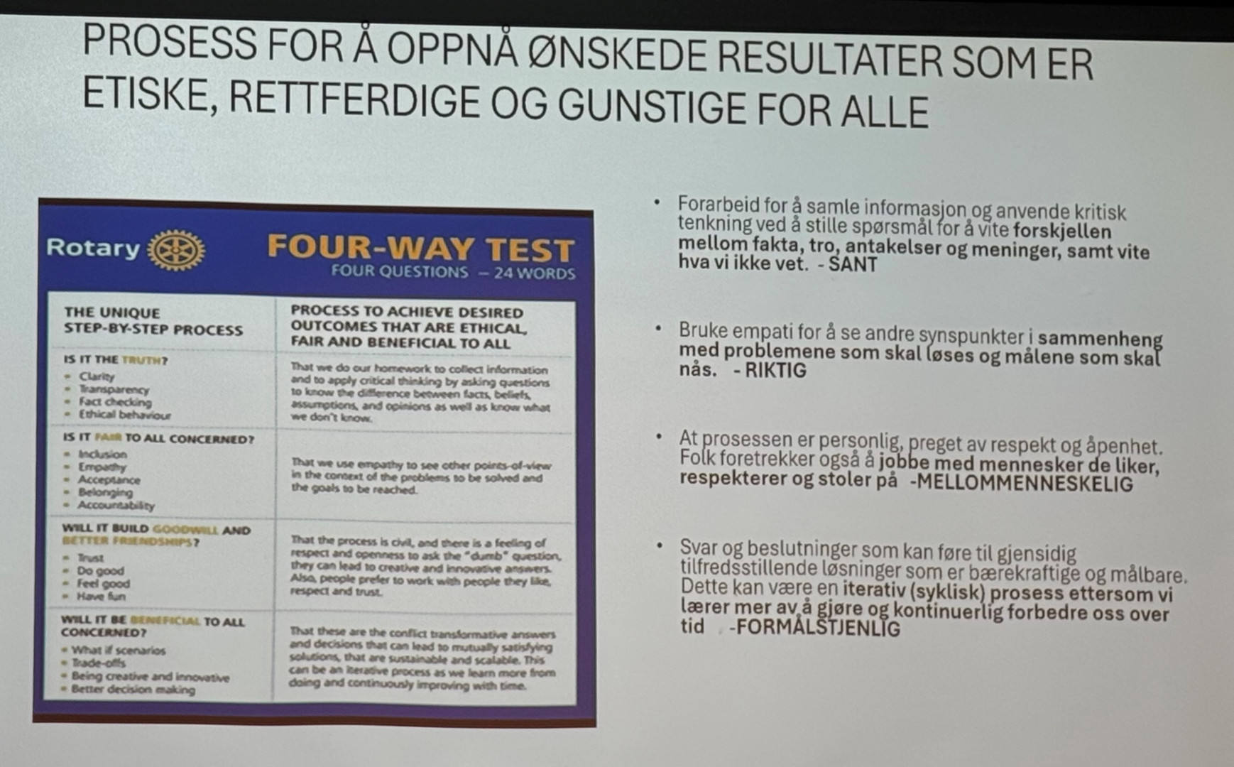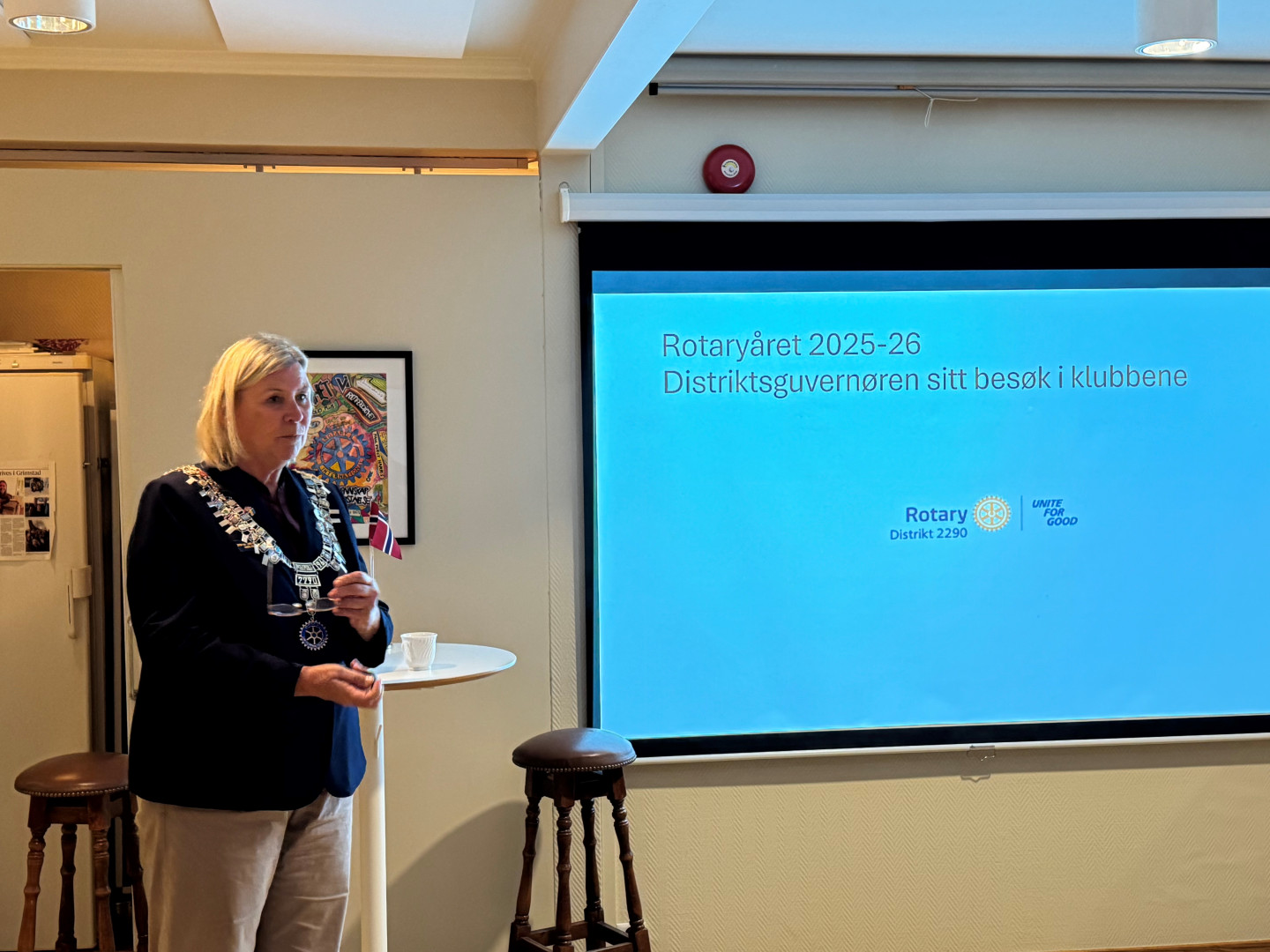 President Siv Lene Gangenes Skar presenterte klubben, før DG Astrid Danielsen startet med å gå gjennom årets roller og organisering i Rotarys distrikt 2290. Det ble også tid til å gjennomgå og reflektere over 4-spørsmålsprøven, med tanke på å forklare bakgrunn og mening i et større perspektiv. Det ble også fremmet behov fra klubbens side, eksempelvis støtte fra Distriktet ved søknader om Global Grants.